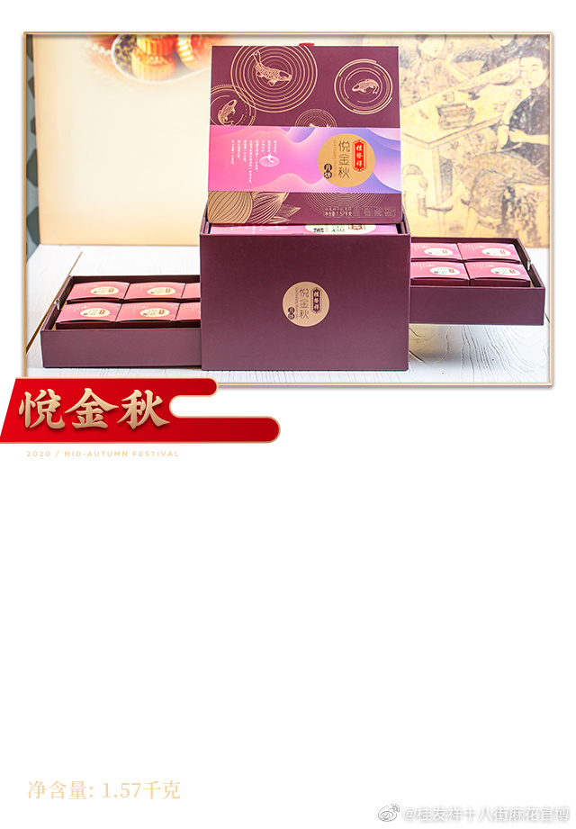 荷花锦鲤环绕连年有余的字样,便是连年有余礼盒了。传统的大红纸盒包装,采用了传统的经典馅料,这是桂发祥固执于传统的匠心制作。经典的京式提浆月饼,适合家中老人的口味。