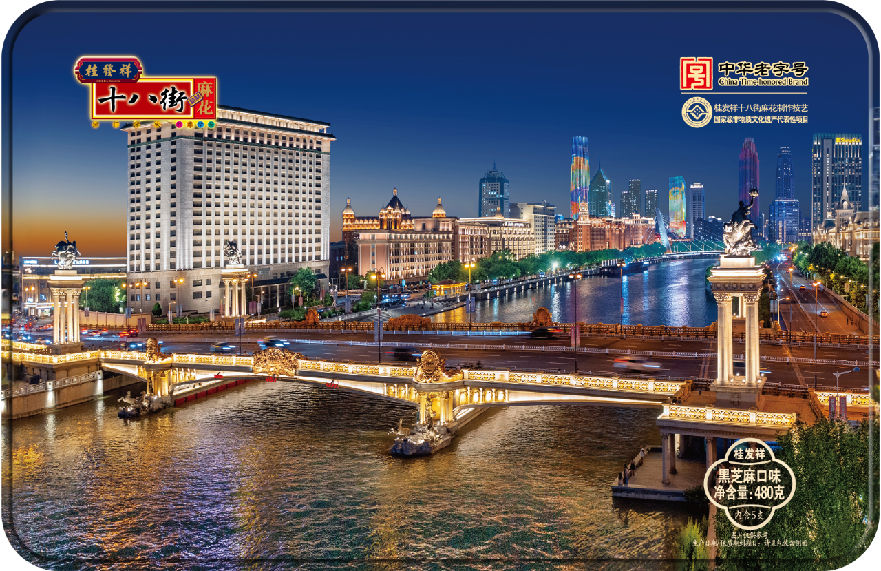 四座地标桥梁——解放桥、大光明桥、永乐桥、北安桥,以夜景实景定格海河的璀璨瞬间。铁盒上盖桥梁轮廓立体浮现,指尖轻触,仿佛乘游轮穿越时空,感受海河晚风拂面的浪漫。
