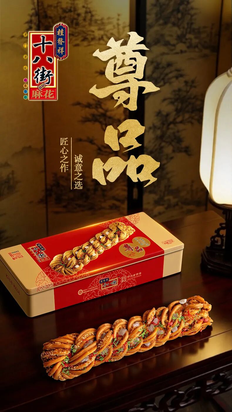 “尊品”之谓,不仅在于其“大”,更在于其承载的“非遗匠心之重”与“津门文化之魂”。尊品麻花礼盒是桂发祥对传统技艺的虔敬传承,是对尊贵客人的至诚献礼,更是天津味道走向世界的华美篇章。1000g的重量级麻花,能够彰显十八街麻花作制技艺作为国家级非物质文化遗产代表性项目精髓,也是目前十八街麻花在售品种中最大的麻花。