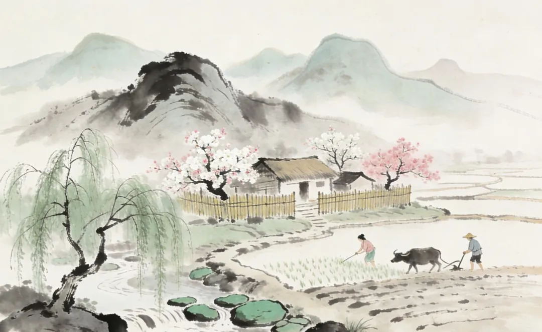 玉米:金穗初垂,田垄绵延,远山脚下的屋舍静谧安然,寓意丰收在望的饱满与温暖。