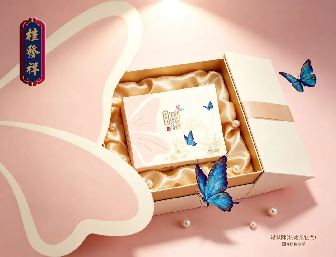 桂发祥蝴蝶酥整体造型宛若翩跹欲飞的蝴蝶,翅膀轮廓圆润灵动,层次纹理清晰自然,温润金黄色泽在光影下熠熠生辉,自带精致氛围感。包装设计以蝴蝶为核心视觉符号,左侧蝶翼轮廓,搭配古典花卉纹样与现代清新插画,淡雅色调柔和温馨,作为伴手礼馈赠亲友,都尽显心意。