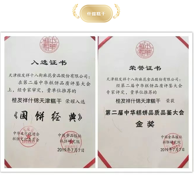 桂发祥什锦天津糕干于2019年荣获第二届中华糕饼品质品鉴大会金奖并荣耀入选《国饼经典》。