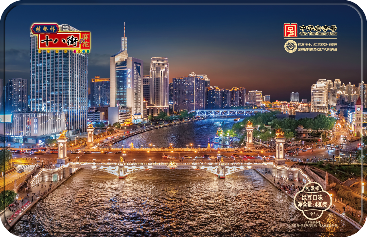 四座地标桥梁——解放桥、大光明桥、永乐桥、北安桥,以夜景实景定格海河的璀璨瞬间。铁盒上盖桥梁轮廓立体浮现,指尖轻触,仿佛乘游轮穿越时空,感受海河晚风拂面的浪漫。